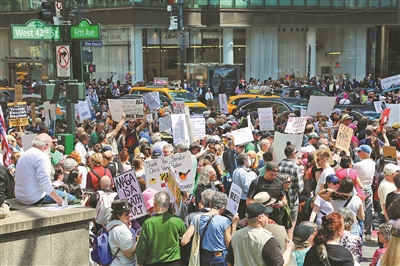 4月19日,美国多地民众走上街头,抗议现政府加征关税、大规模裁员等政策。图为当天,人们在美国纽约街头参加抗议活动。