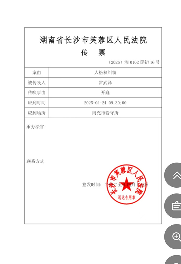 2024年12月,雷武泽向自己的户籍地所在法院——长沙市芙蓉区法院递交了《民事起诉状》,向王浩文、胡某雄索赔6元,并要求二人公开赔礼道歉。2025年1月2日,长沙市芙蓉区法院正式受理此案。