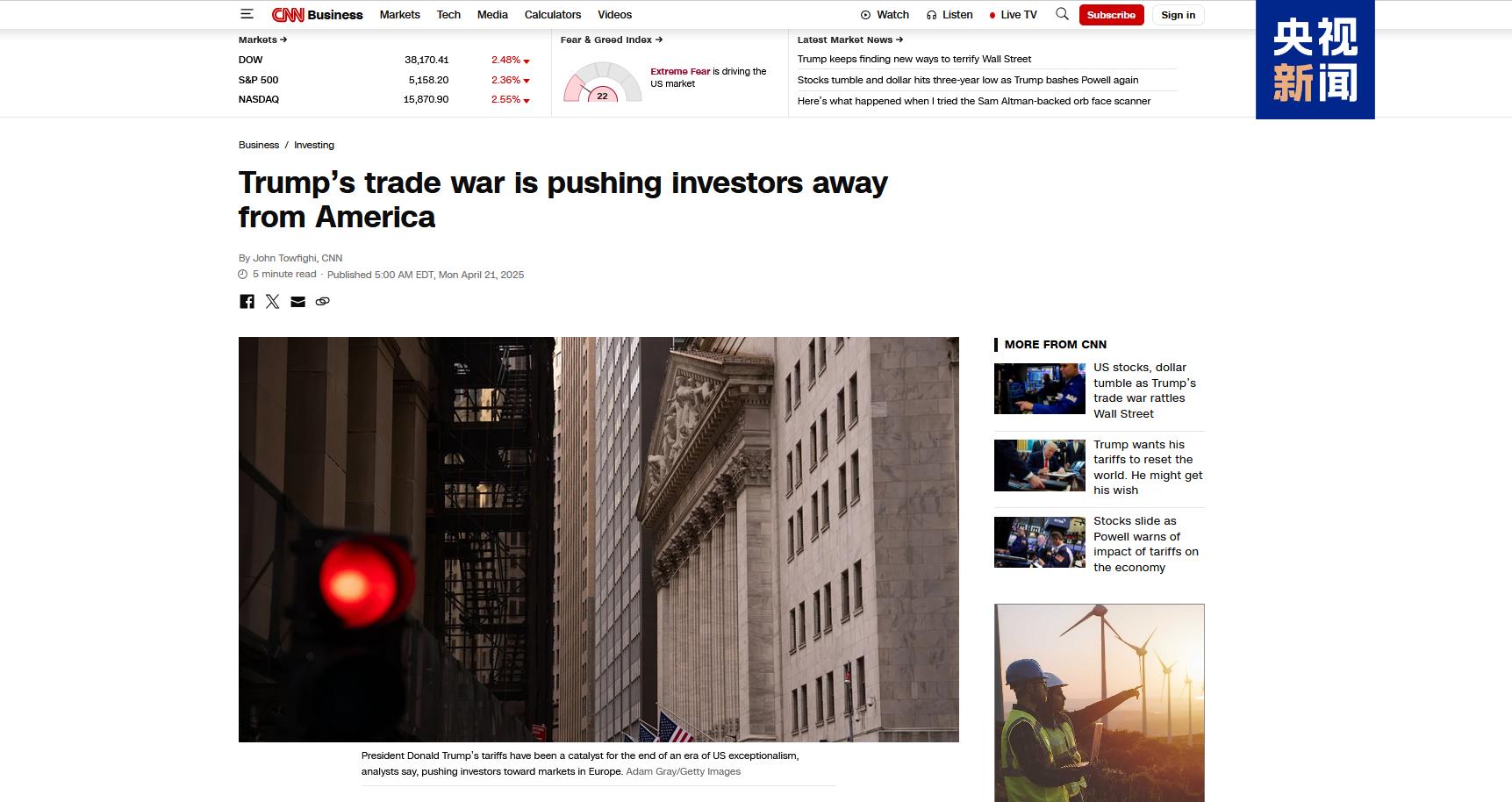 △美国有线电视新闻网近日以“特朗普的贸易战正将投资者推离美国”为题刊文。
