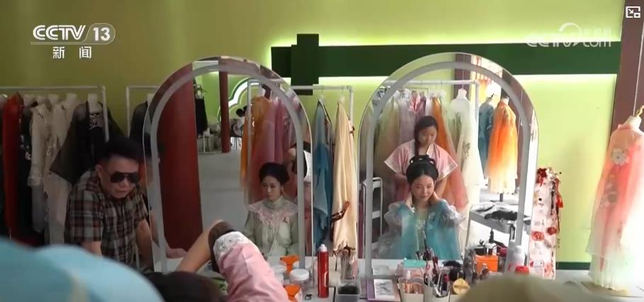 在横店影视城的清明上河图景区内,记者看到,一家“横店旅拍”正忙碌着,化妆师们手法娴熟地给客人上妆、盘头,询问客人的喜好,及时调整妆面,并给进店询问的顾客介绍产品,推荐合适的服饰妆造。