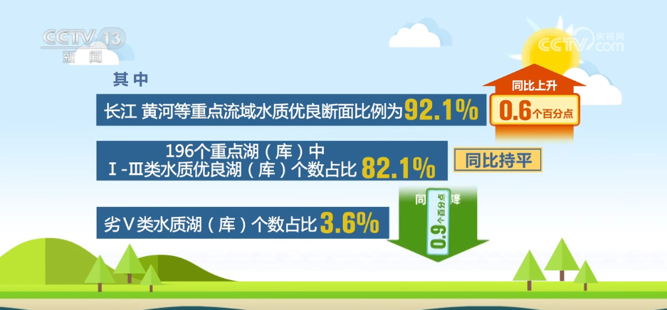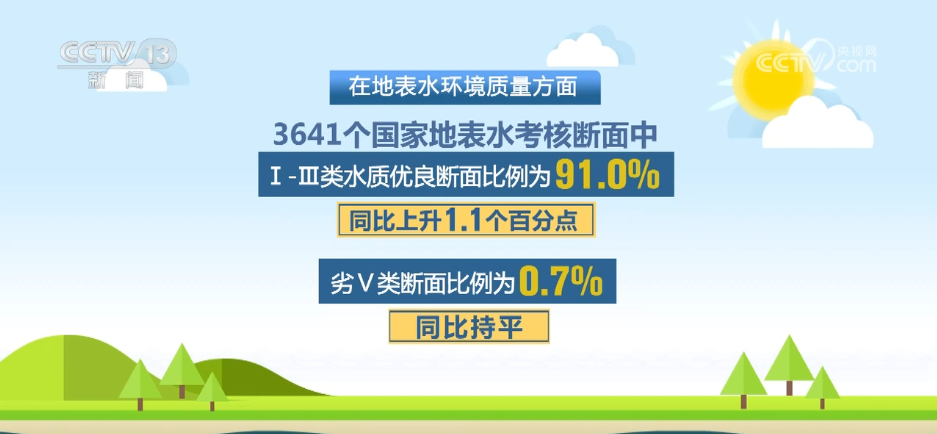 在地表水环境质量方面,3641个国家地表水考核断面中,Ⅰ—Ⅲ类水质优良断面比例为91.0%,同比上升1.1个百分点;劣Ⅴ类断面比例为0.7%,同比持平。其中,长江、黄河等重点流域水质优良断面比例为92.1%,同比上升0.6个百分点。196个重点湖(库)中,Ⅰ—Ⅲ类水质优良湖(库)个数占比82.1%,同比持平;劣Ⅴ类水质湖(库)个数占比3.6%,同比下降0.9个百分点。