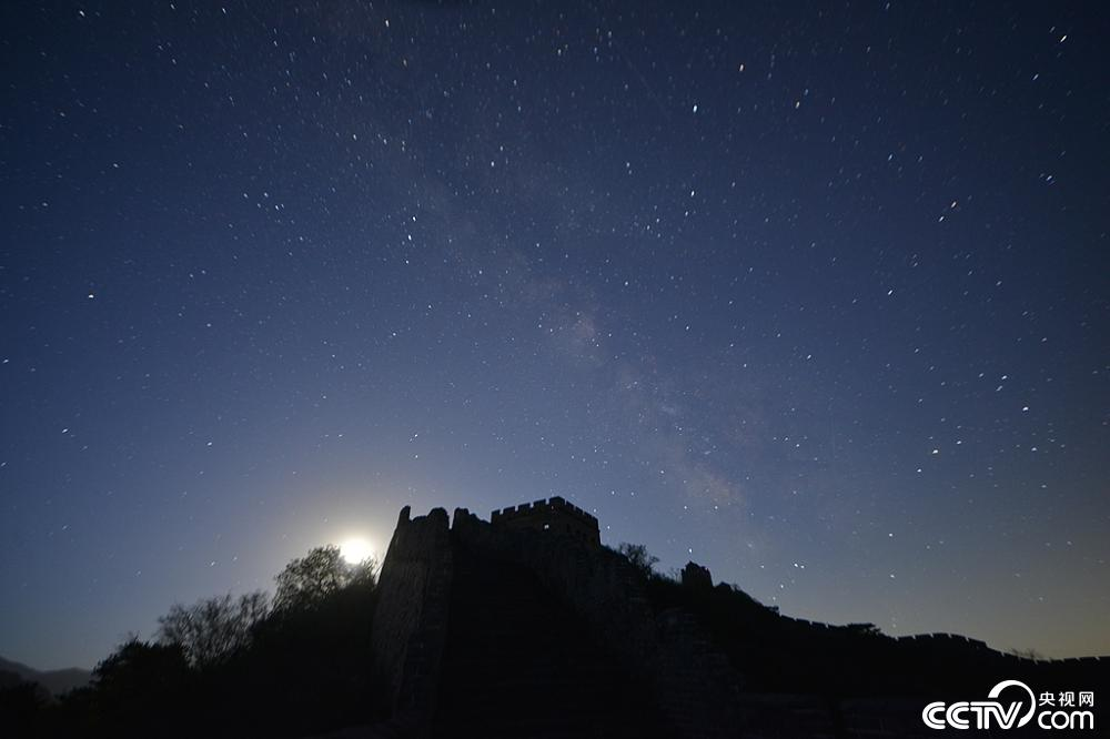 2025年4月22日,河北承德,滦平县金山岭长城古建与夜空星河相互映衬,不时有天琴座流星雨划过长城上空,璀璨夺目。