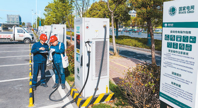 近日,在安徽省南陵县籍山镇来邦广场充电站,国网芜湖供电公司工作人员对充电桩进行巡检。肖本祥摄(人民视觉)