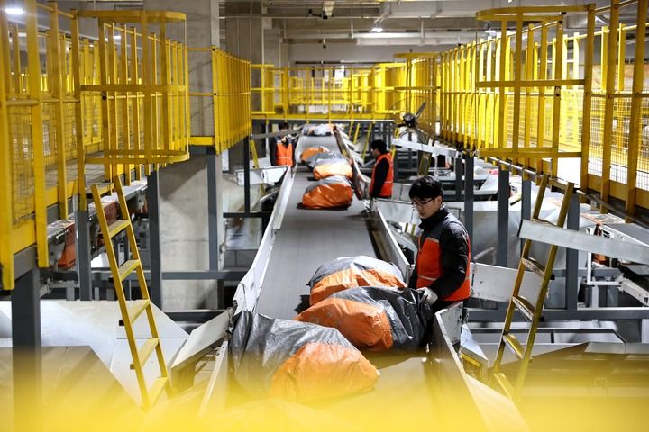 工人在河北省固安县的申通快递华北转运中心内工作(2025年2月26日摄)。新华社记者 王晓 摄