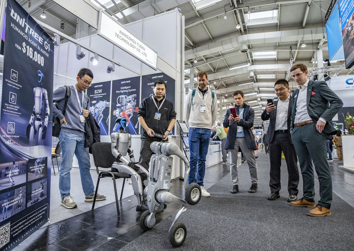 2025年4月1日,在德国汉诺威工业博览会上,人们在宇树科技展区观看机器狗演示。新华社记者 张帆 摄