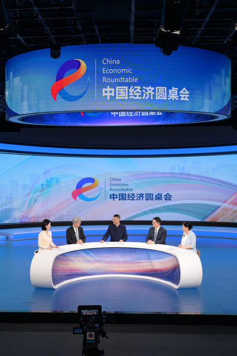 嘉宾们在第十五期“中国经济圆桌会”大型全媒体访谈节目录制现场交流发言。新华社记者 李贺 摄