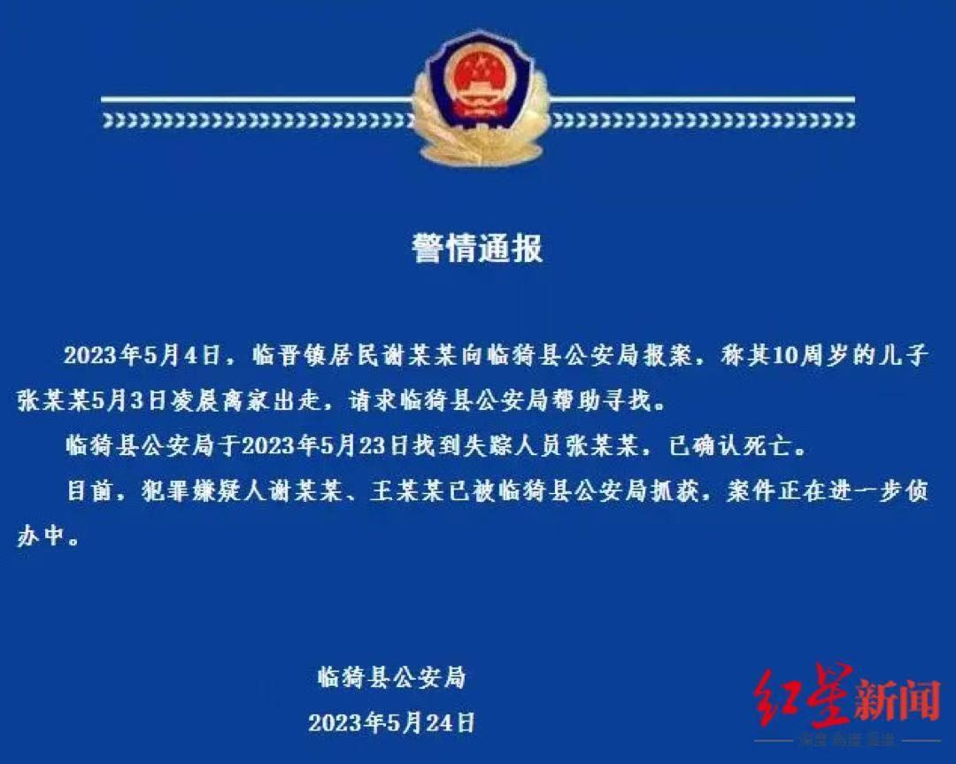 时间回到2023年5月初,寻找失踪的10岁男孩乔乔,成为当时的热点话题。按照当年5月24日运城临猗县公安局发布的警情通报,乔乔生母谢某某在5月4日向临猗县公安局报案,称其儿子在5月3日凌晨离家出走,请求警方帮助寻找。