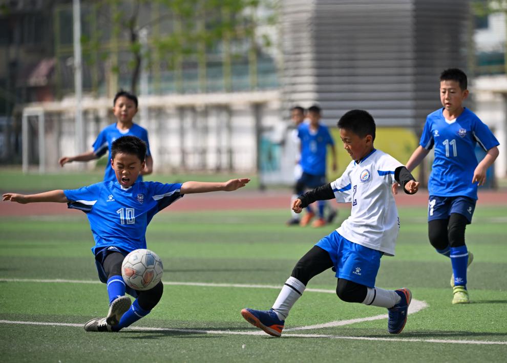 ↑2025年4月16日,天津市河西区东楼小学队球员马彬轩(左)与天津市河西区土城小学队球员付腾羽(中)拼抢。新华社记者 孙凡越 摄