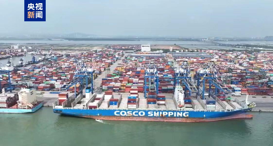 在广州港南沙港区二期码头,全长300米的“中远海运伏尔加河”集装箱班轮正停靠在泊位上,巨大的桥吊正在将400余柜来自广东地区生产的电冰箱、小家电配件、汽车配件等商品装吊上船,码头繁忙、有序。