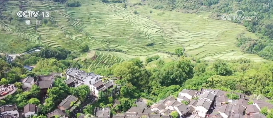 错落有致的徽派民居与山野梯田交相辉映,勾勒出一幅美丽的水墨画卷。
