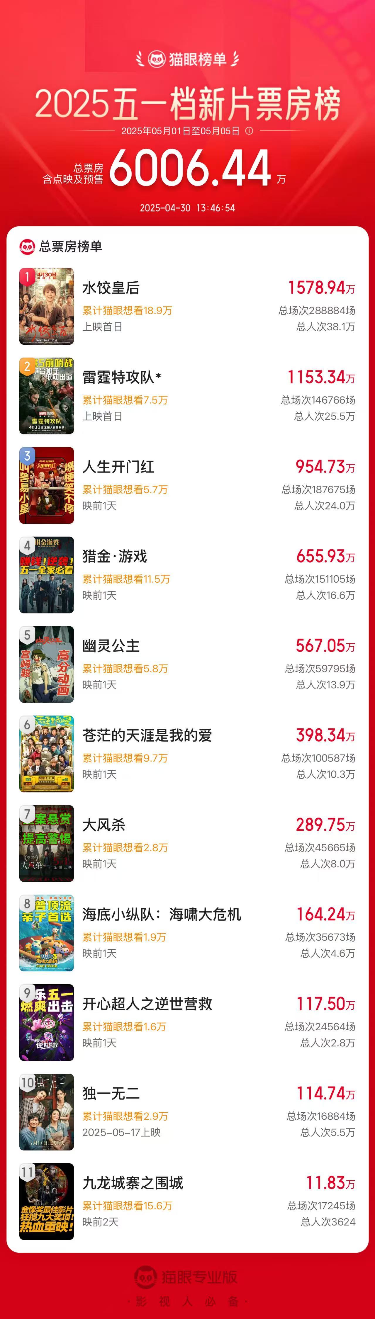 ,《水饺皇后》《雷霆特攻队*》《人生开门红》分列新片票房榜前三位。