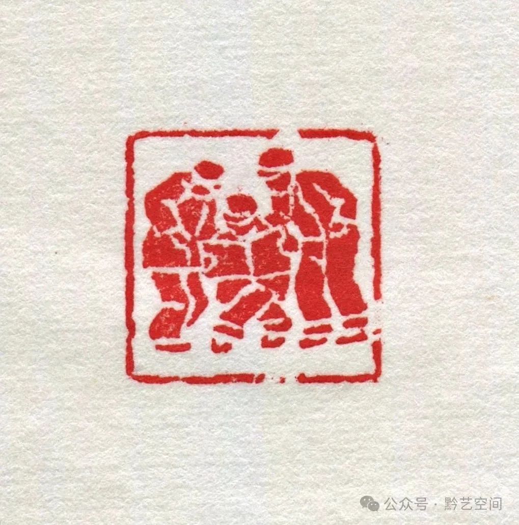 “打腰鼓”,二人打鼓起舞,双手托鼓,腰带飘舞,相离相合,极具动态。“读报图”,取法汉画像而赋以新意。三人合一,中间人张报端坐,左右二人伸首凝神共读,人物静中寓动,比例适度,画面简约而细致入微矣!边款曰:“学文化、识时务,读报小组,二者兼顾。楚并记。”“阖谭欢喜图”,是来楚生20世纪70年代刻笔者一家生肖,猴之小憩、蛇之灵动、兔之寻觅、猪与狗的呼应互动,均生动活泼,有呼之欲出之感。边款曰:“衍方阖谭欢喜,初升作。”
