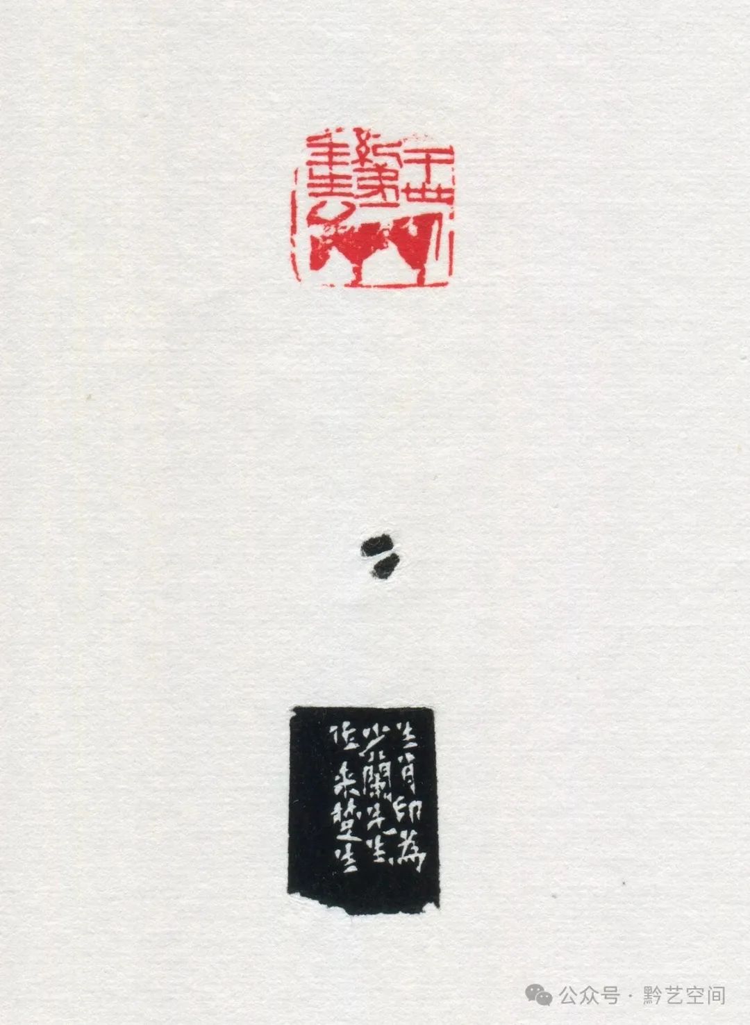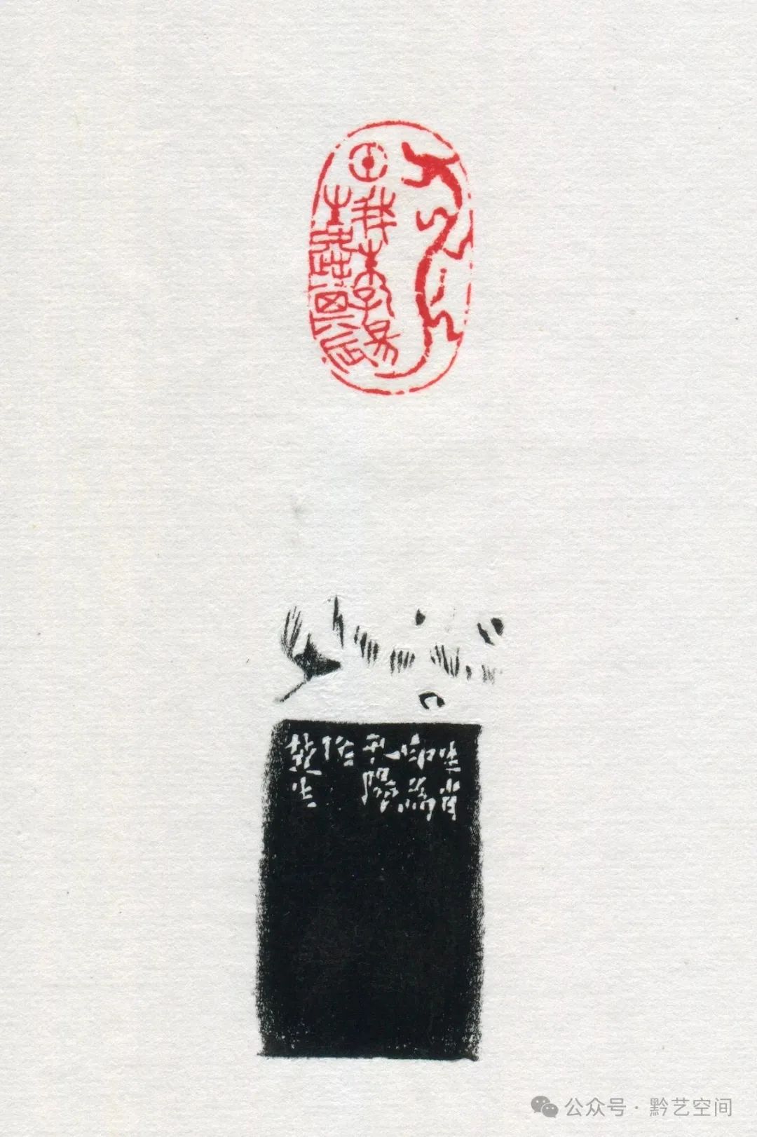 “双鼠图”,上下各刻一鼠,其首各处左右,其爪交错互动。粗看此印,浑然不知何物,细审才恍然大悟,是上下两只勾轮廓之鼠,极具装饰性,构思之妙,令人叫绝。其边款曰:“才堪 墨,凫。”乃为嗜墨之鼠矣!