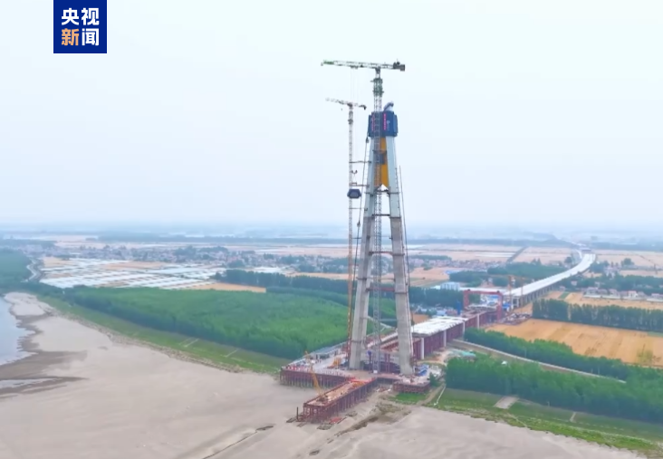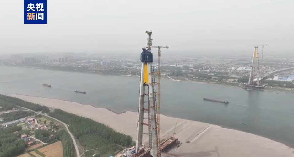 今天上午,观音寺长江大桥北岸主塔钢壳最后一个节段起吊攀升200多米后,与上一节段达到毫米级对接后完成吊装,大桥两个主塔封顶。