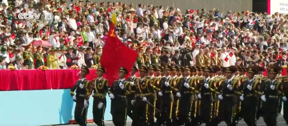 在现场,中国仪仗队员整齐划一的昂扬军姿,受到越南民众的热烈欢迎。此次中国仪仗队跨境参加越南庆典活动,充分彰显和传递了中越两军深厚友谊和互信。中国援越高级军官后代、老兵及家属代表也受邀参加阅兵式观礼。