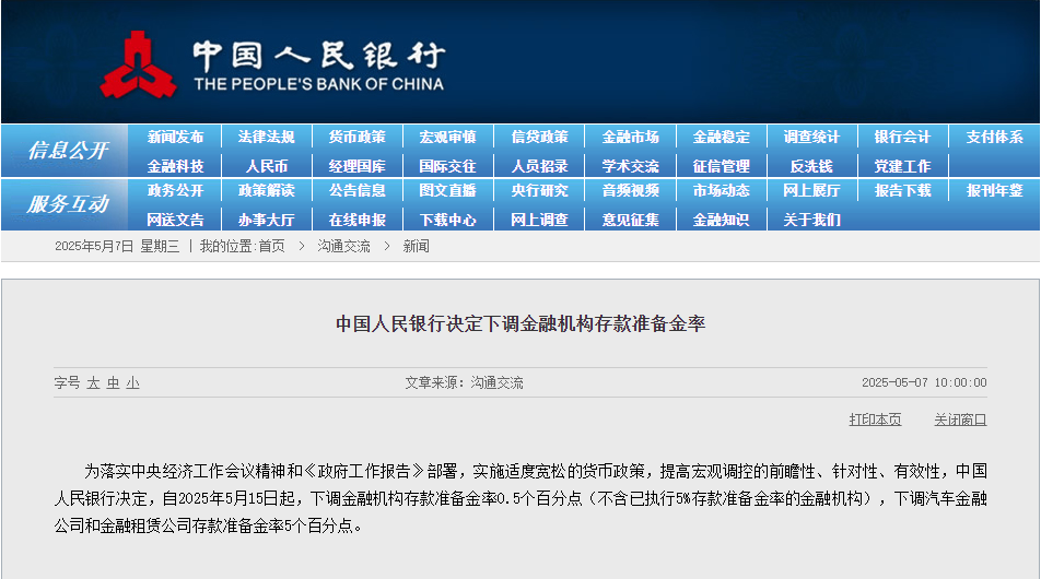 央视网消息:为落实中央经济工作会议精神和《政府工作报告》部署,实施适度宽松的货币政策,提高宏观调控的前瞻性、针对性、有效性,中国人民银行决定,自2025年5月15日起,下调金融机构存款准备金率0.5个百分点(不含已执行5%存款准备金率的金融机构),下调汽车金融公司和金融租赁公司存款准备金率5个百分点。