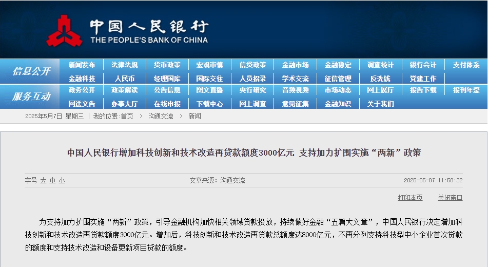 正在阅读:中国人民银行增加科技创新和技术改造再贷款额度3000亿元 支持加力扩围实施“两新”政策