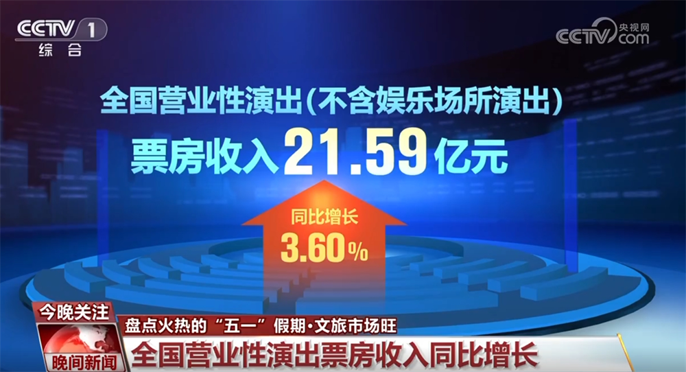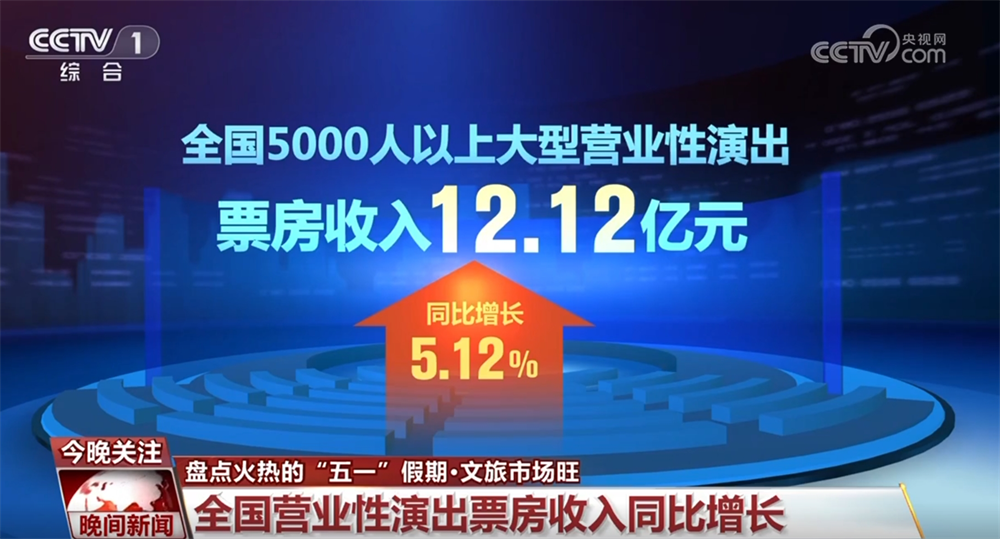数据显示,“五一”期间,全国营业性演出(不含娱乐场所演出)票房收入21.59亿元,同比增长3.60%;全国5000人以上的大型营业性演出票房收入达到12.12亿元,同比增长5.12%;全国大中型旅游演艺项目票房收入6.85亿元,同比增长9.08%,观众人数558.43万人次,同比增长6.11%。