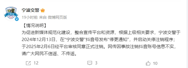 ·宁波交警辟谣“注销短视频账号与保时捷事故有关”:去年已发布停更通知。