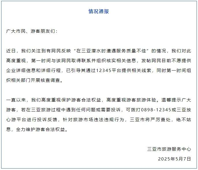 ·网民反映“潜水时遭遇服务质量不佳”,三亚开展核查调查。