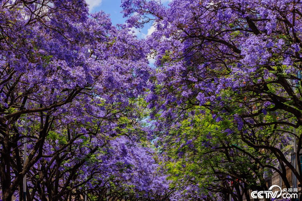 云南昆明教场中路,蓝花楹绽放似“紫色云霞”,美不胜收。