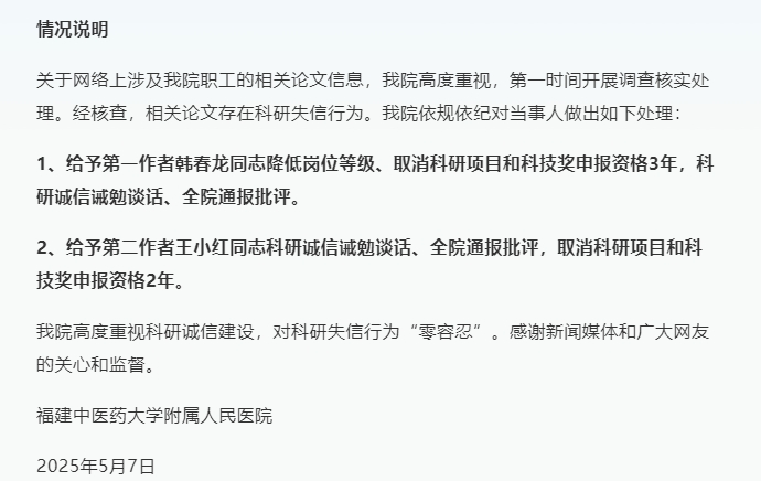 ·妇科病论文男性患者样本超6成?福建省人民医院回应:存在科研失信,当事人被处理。