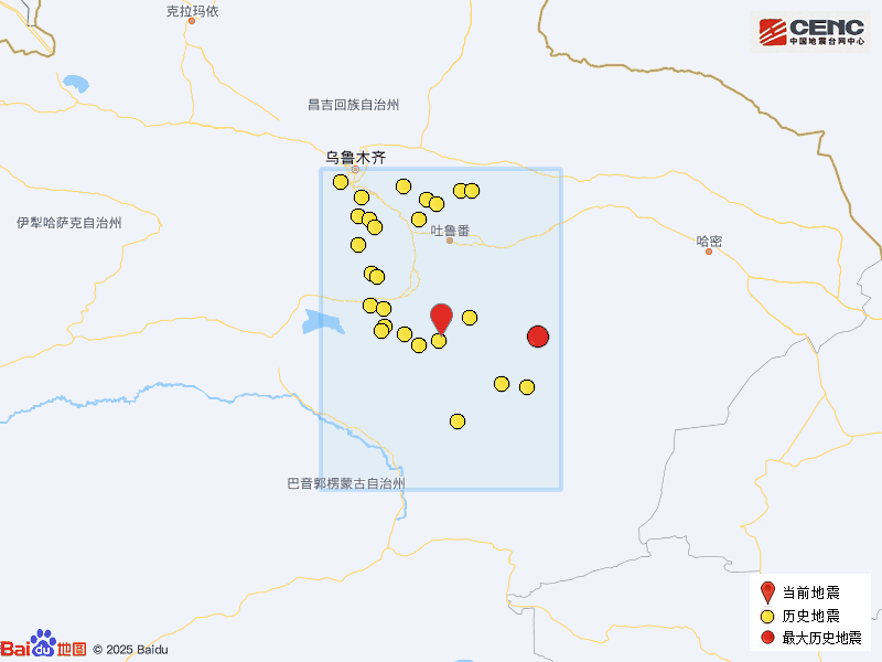 历史地震:根据中国地震台网速报目录,震中周边200公里内近5年来发生3级以上地震共27次,最大地震是2022年6月24日在新疆吐鲁番市鄯善县发生的5.1级地震(距离本次震中135公里),历史地震分布如图。