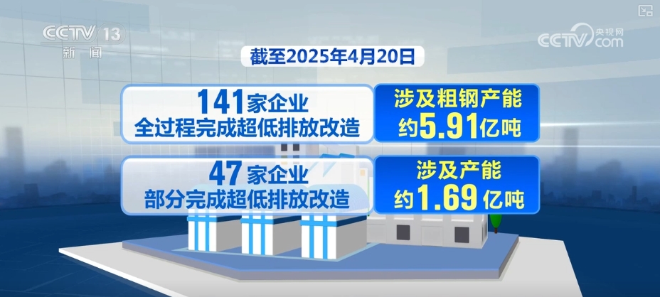 截至2025年4月20日,141家钢铁企业全过程完成超低排放改造,涉及粗钢产能约5.91亿吨;47家钢铁企业部分完成超低排放改造,涉及产能约1.69亿吨。