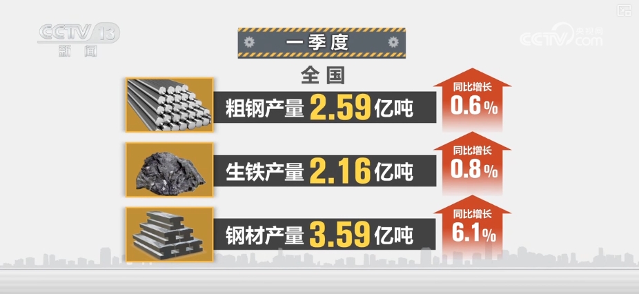 数据显示,一季度,全国粗钢产量2.59亿吨,同比增长0.6%;生铁产量2.16亿吨,同比增长0.8%;钢材产量3.59亿吨,同比增长 6.1%。