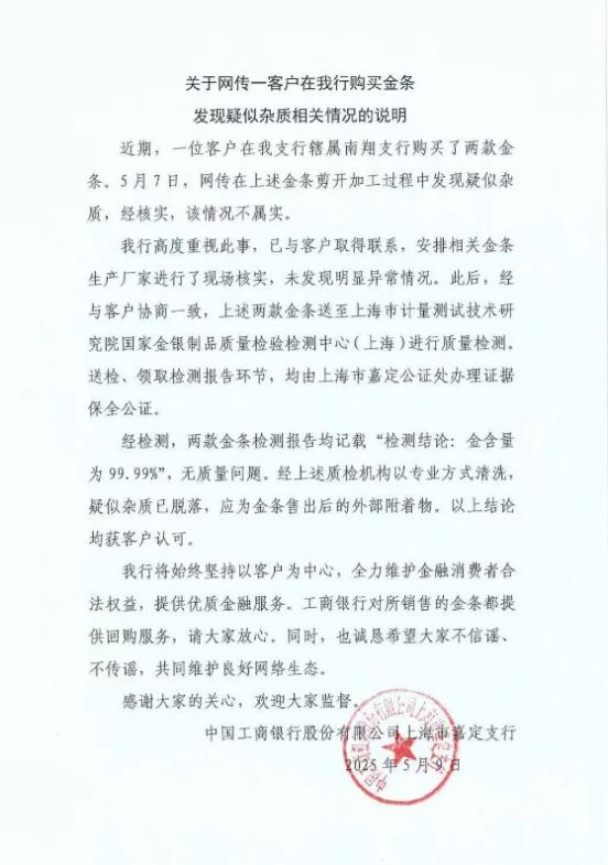 ·被曝金条掺假?工行回应:疑似杂质已脱落,应为金条售出后的外部附着物。