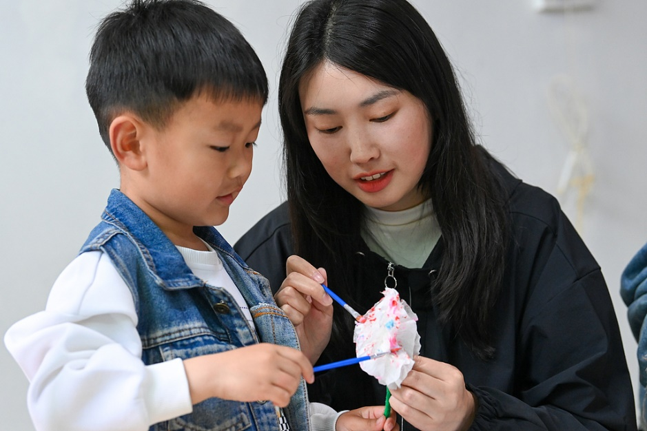 重庆市酉阳土家族苗族自治县一幼儿园,孩子与手工制作鲜花的母亲幸福合影。