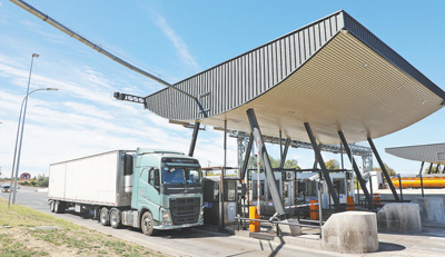 货车通过智利5号公路塔尔卡—奇廉段位于塔尔卡市的一处收费站。人民日报拉美中心分社 路易斯·布兰科摄