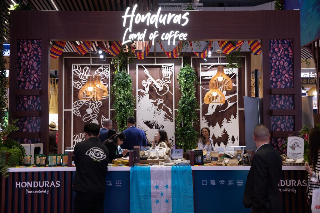 2023年11月6日,参观者在第六届进博会国家展洪都拉斯展台咨询咖啡豆等展品信息。新华社记者 金立旺 摄