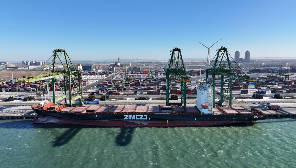 2023年12月21日,“罗安达轮”集装箱船靠泊在天津港(无人机照片)。当日,“罗安达轮”集装箱船正式从天津港出发,驶向哥伦比亚、厄瓜多尔、秘鲁、智利等南美洲国家,标志着天津港正式开通天津—南美西新航线。新华社记者 赵子硕 摄