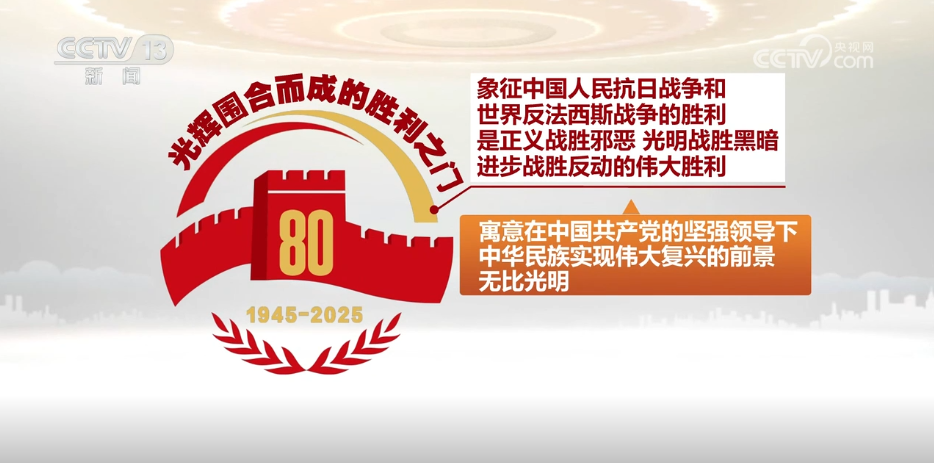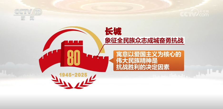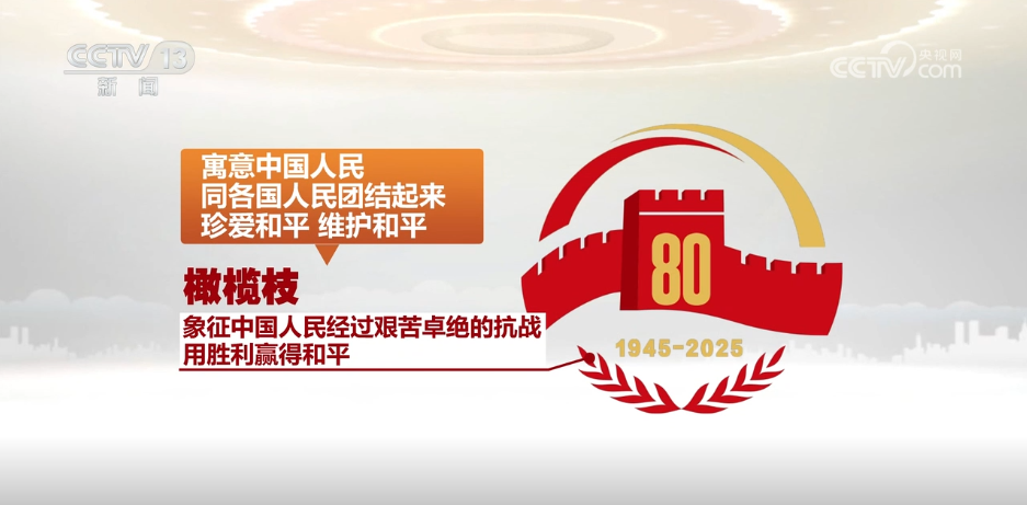 标识由长城、橄榄枝、光辉、数字“80”、时间“1945-2025”构成。长城象征全民族众志成城奋勇抗战,寓意以爱国主义为核心的伟大民族精神是抗战胜利的决定因素。橄榄枝象征中国人民经过艰苦卓绝的抗战,用胜利赢得和平,寓意中国人民同各国人民团结起来,珍爱和平、维护和平。光辉围合而成的胜利之门,象征中国人民抗日战争和世界反法西斯战争的胜利是正义战胜邪恶、光明战胜黑暗、进步战胜反动的伟大胜利,寓意在中国共产党的坚强领导下,中华民族实现伟大复兴的前景无比光明。