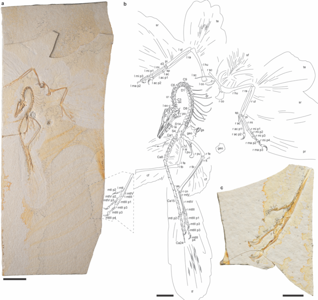 这件标本由菲尔德自然历史博物馆于2022年收藏,是目前发现体型最小的始祖鸟标本,只有近鸽子大小。标本极为完整,大部分骨骼保存较为立体,同时保存有罕见的软组织(如皮肤、趾垫)和羽毛等重要信息,为深入理解其形态信息与生态适应提供了重要证据。