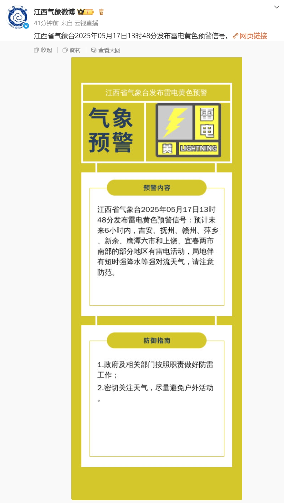 央视网消息:据@江西气象微博 官微消息,江西省气象台5月17日13时48分发布雷电黄色预警信号:预计未来6小时内,吉安、抚州、赣州、萍乡、新余、鹰潭六市和上饶、宜春两市南部的部分地区有雷电活动,局地伴有短时强降水等强对流天气,请注意防范。