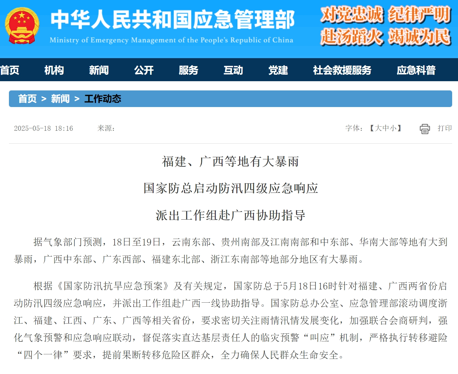 根据《国家防汛抗旱应急预案》及有关规定,国家防总于5月18日16时针对福建、广西两省份启动防汛四级应急响应,并派出工作组赴广西一线协助指导。国家防总办公室、应急管理部滚动调度浙江、福建、江西、广东、广西等相关省份,要求密切关注雨情汛情发展变化,加强联合会商研判,强化气象预警和应急响应联动,督促落实直达基层责任人的临灾预警“叫应”机制,严格执行转移避险“四个一律”要求,提前果断转移危险区群众,全力确保人民群众生命安全。