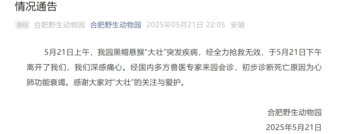 合肥野生动物园发布情况通报,5月21日上午,该园黑帽悬猴“大壮”突发疾病,经全力抢救无效,于5月21日下午离开了我们。