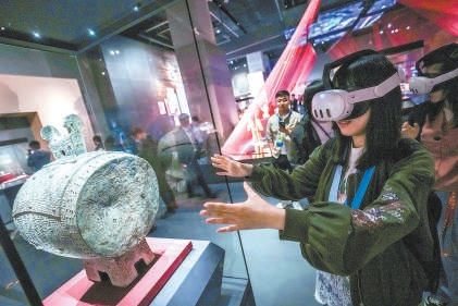 观众戴上MR(混合现实)设备,敲响“崇阳铜鼓”。