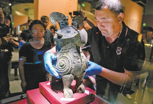 本次展览许多博物馆借出“重宝”,工作人员将收藏于国家博物馆的鸮尊小心翼翼地摆放入展柜内。