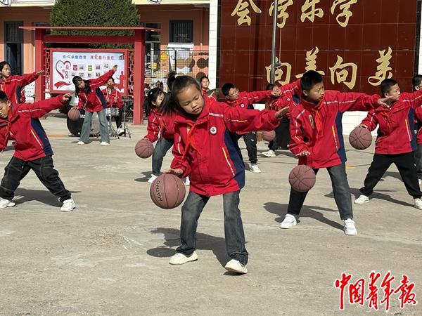 4月13日,山西运城闻喜县后宫中心小学,因为学生数量少,多个年级的学生一起跳篮球操。高年级孩子组成的架子鼓乐队在旁边配乐“助威”。中青报·中青网记者 李新玲/摄