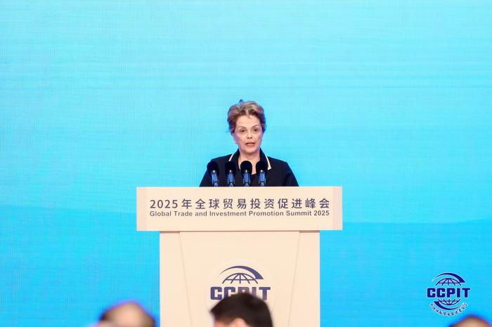 5月22日,由中国贸促会主办的2025年全球贸易投资促进峰会在北京举行。新开发银行行长、巴西前总统迪尔玛·罗塞芙在开幕式致辞。中国贸促会供图