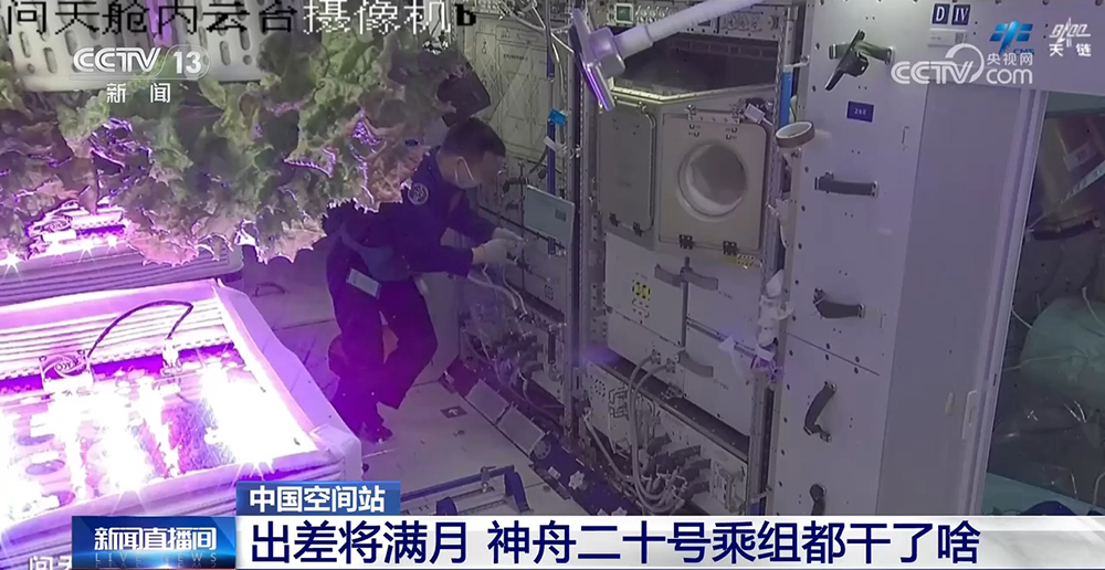 在站内设备检查维护方面,乘组完成了再生生保系统、饮水分配器、太空跑台等相关装置设备维护及组件更换工作,开展了舱内环境清洁、物资转移及整理。