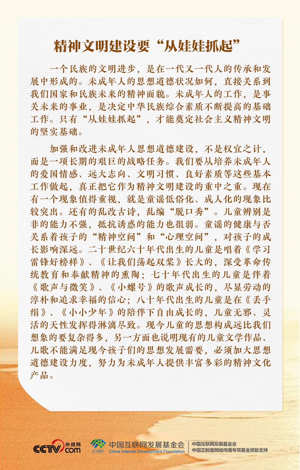 他态度鲜明,清晰阐述了“加强和改进未成年人思想道德建设”之于“精神文明建设”的重要性,直言只有“从娃娃抓起”,才能奠定社会主义精神文明的坚实基础。