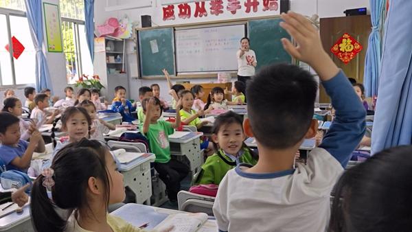 4月10日,广西南宁民族大道东段小学,融合教育课堂内,学生踊跃举手。江畅/摄