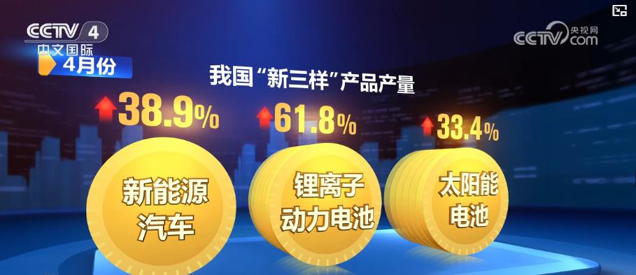 随着传统产业改造升级,新兴产业加快发展,高技术产品需求不断扩大。4月份,我国新能源汽车、锂离子动力电池、太阳能电池等“新三样”产品产量分别增长38.9%、61.8%和33.4%。智能无人飞行器制造增长74.2%,工业机器人产量增长51.5%。