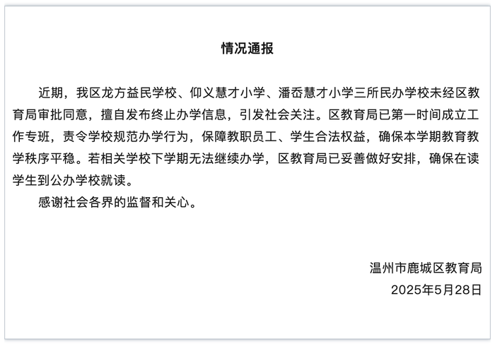 央视网消息:温州市鹿城区教育局5月28日通报:近期,我区龙方益民学校、仰义慧才小学、潘岙慧才小学三所民办学校未经区教育局审批同意,擅自发布终止办学信息,引发社会关注。区教育局已第一时间成立工作专班,责令学校规范办学行为,保障教职员工、学生合法权益,确保本学期教育教学秩序平稳。若相关学校下学期无法继续办学,区教育局已妥善做好安排,确保在读学生到公办学校就读。