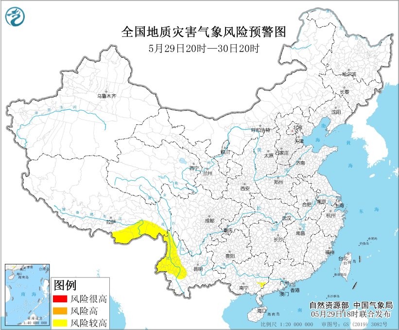 预计,5月29日20时至30日20时,广西东南部、云南西部、西藏东南部等地部分地区发生地质灾害的气象风险较高(黄色预警)。各级政府及有关部门按照应急预案做好地质灾害防御工作。请社会公众及时关注地质灾害气象风险预警信息,谨慎前往地质灾害预警区域。黄色预警区内人员,请随时关注预警信息变化,注意附近警示标志,避免在沟谷、斜坡、陡崖(坎)等高风险地带逗留。
