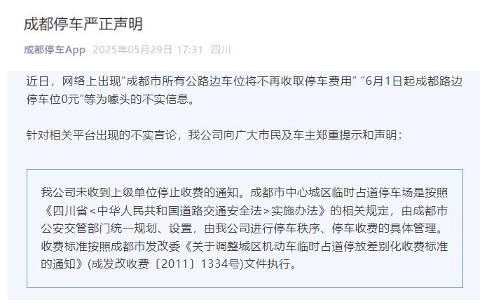 5月29日,成都交投智慧停车产业发展有限公司通过微信公众号“成都停车APP”发布严正声明,称网传“成都市所有公路边车位将不再收取停车费用”“6月1日起成都路边停车位0元”系不实信息。公司未收到上级单位停止收费的通知。